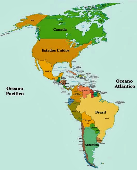Ao analisar o mapa podemos ver que o continente americano é formado por 35 países. È dividido por três regiões: norte, central e sul. A América do Norte é constituída por: Canadá, Estados Unidos e México. A América Central constitui 20 países, são eles: Guatemala, Belize, El Salvador, Costa Rica, Panamá, Nicarágua, Honduras, Jamaica, Cuba, etc. A América do Sul constitui 12, porém tem mais uma ilha que pertence a outro país; os países do Sul são: Brasil, Argentina, Uruguai, Paraguai, Bolívia, Chile, Peru, Colômbia, Venezuela, Guiana, Suriname e Equador. Cinco deles fazem parte do Mercosul. Brasil, Argentina e México são países emergentes e os outros são pobres.